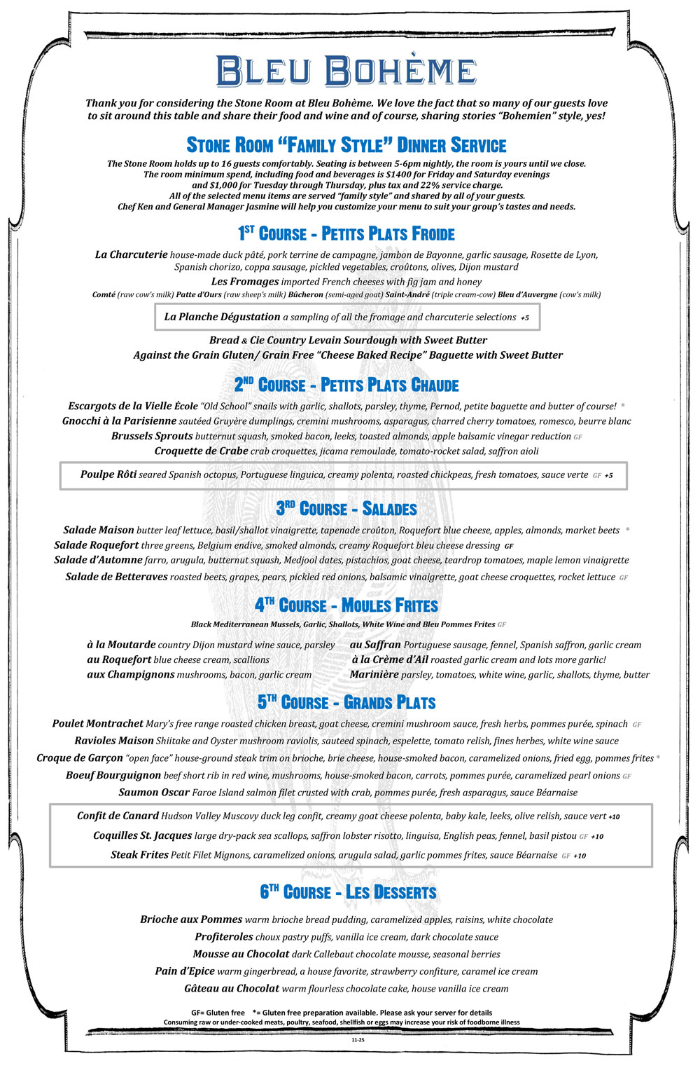 Stone Room events will begin between 5 – 6 p.m. nightly, and the room is yours to enjoy until we close. The room minimum spend is $1,000 Tuesday through Thursday and $1,400 for Friday and Saturday evenings, plus tax and a 22% service charge. Please email:  [email protected] for more information and to create your special event.